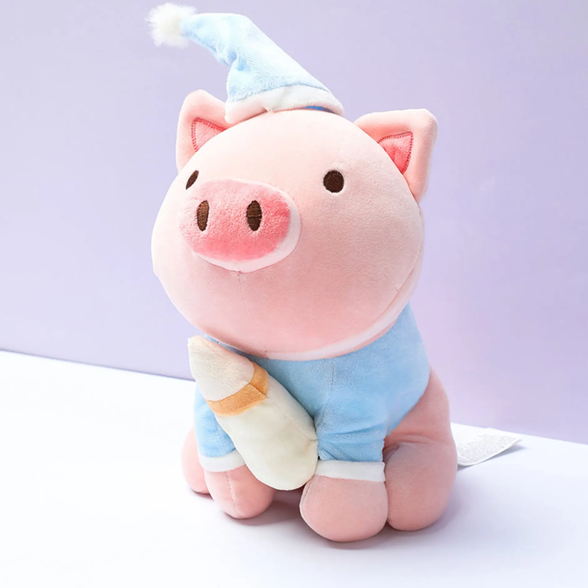 Peluche Maialino Bibi Con Pigiama E Cappellino Azzurro E Bottiglietta Di Latte.