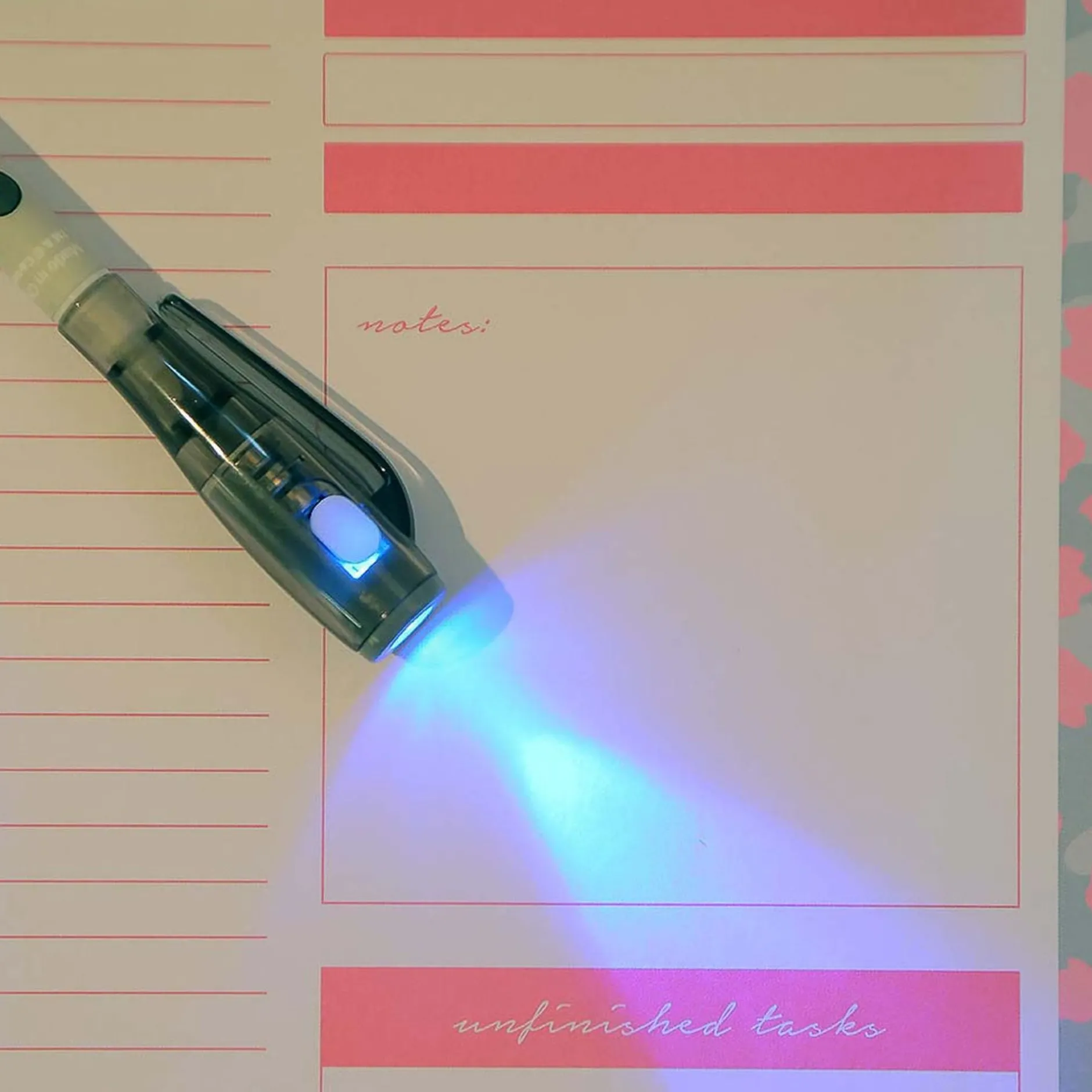 La Penna È Ultifunzionale: Un’Estremità È Riempita Con Inchiostro Particolare Che Necessita Di Luce Uv Per Essere Visibile, L’Altra Estremità È Una Penna Normale.